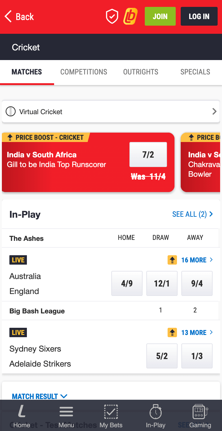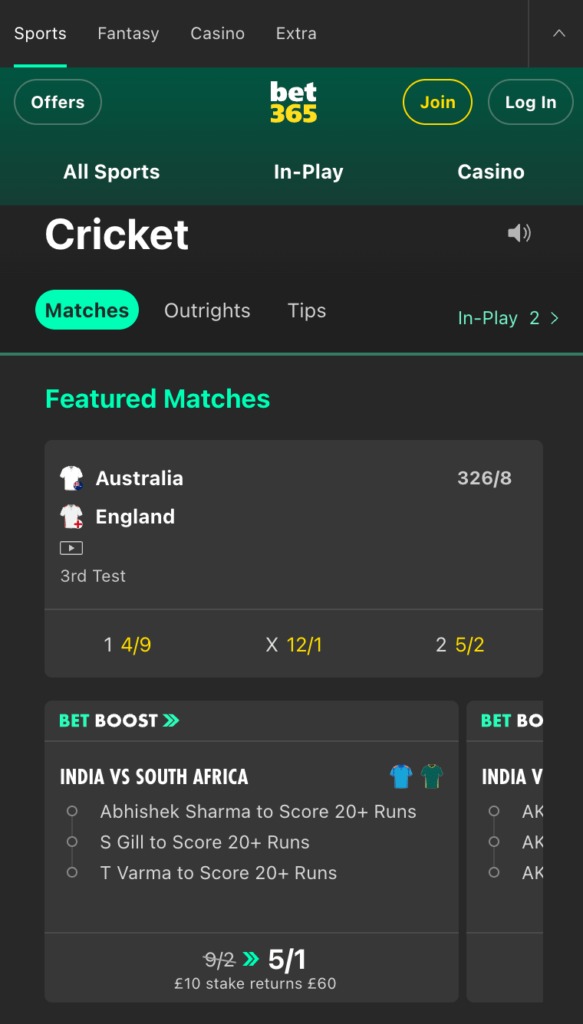 - In-play cricket betting and bet boosts are available on multiple cricket games and competitions.