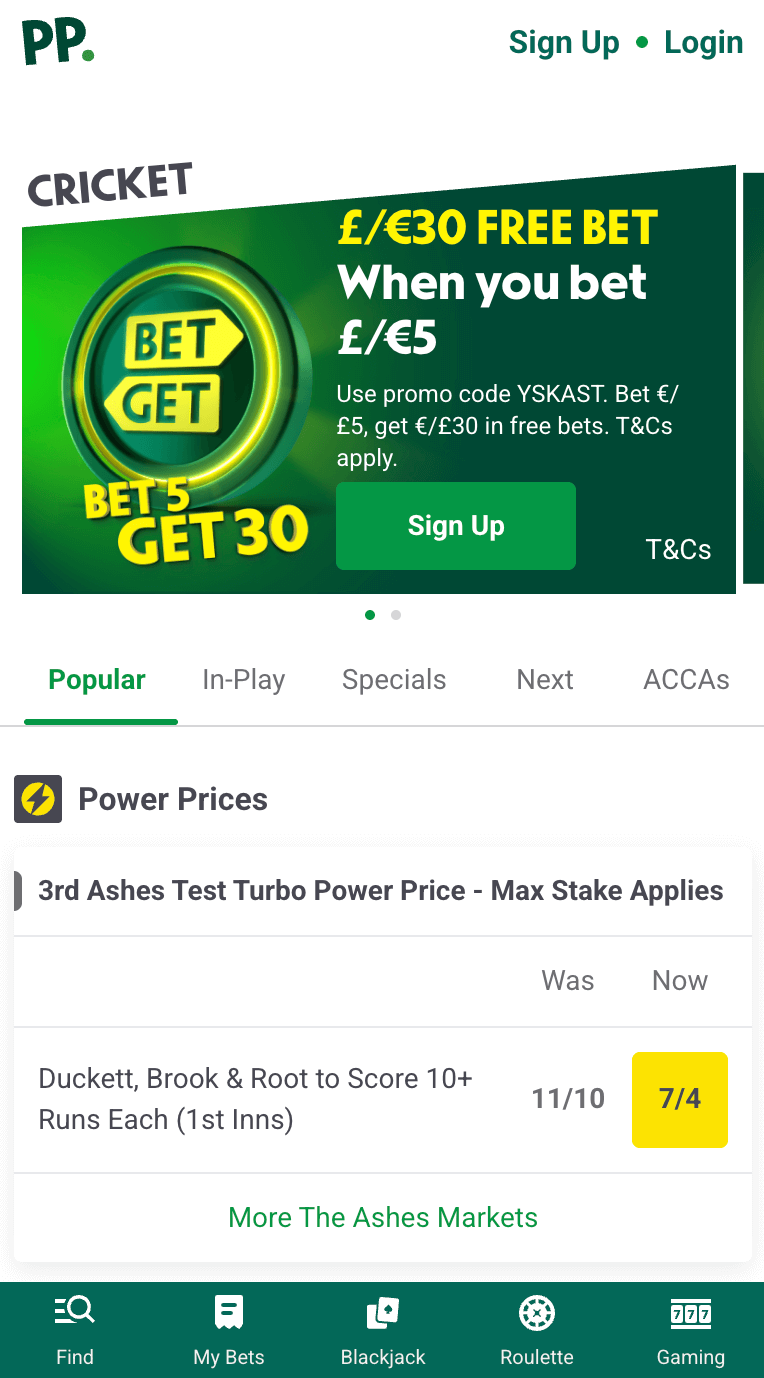 Paddy Power are at number three and have plenty of positives for cricket betting. One of these is their great loyalty program which offers existing customers the chance to earn weekly free bets if they meet a certain qualifying criteria each week. They also have other promotions which can be used on cricket, such as their Friends With Benefits promotion, which gives players the chance to get £20 when they refer a friend to the site.