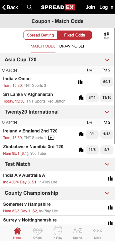 Spreadex covers more markets than some UK betting sites that missed out on a place in our top-ten. This includes player-specific in-play markets such as how many runs a team will score during a match. Not only this, but they also have spread betting available on cricket. You can choose which spread you want to play on, which could be, for example, how many runs a player will score in a match.