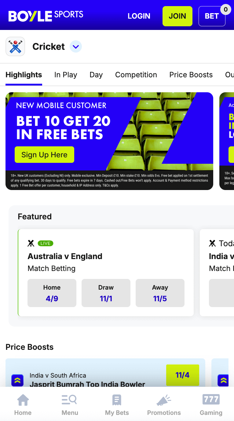 - In-play cricket betting and bet boosts are available on multiple cricket games and competitions.