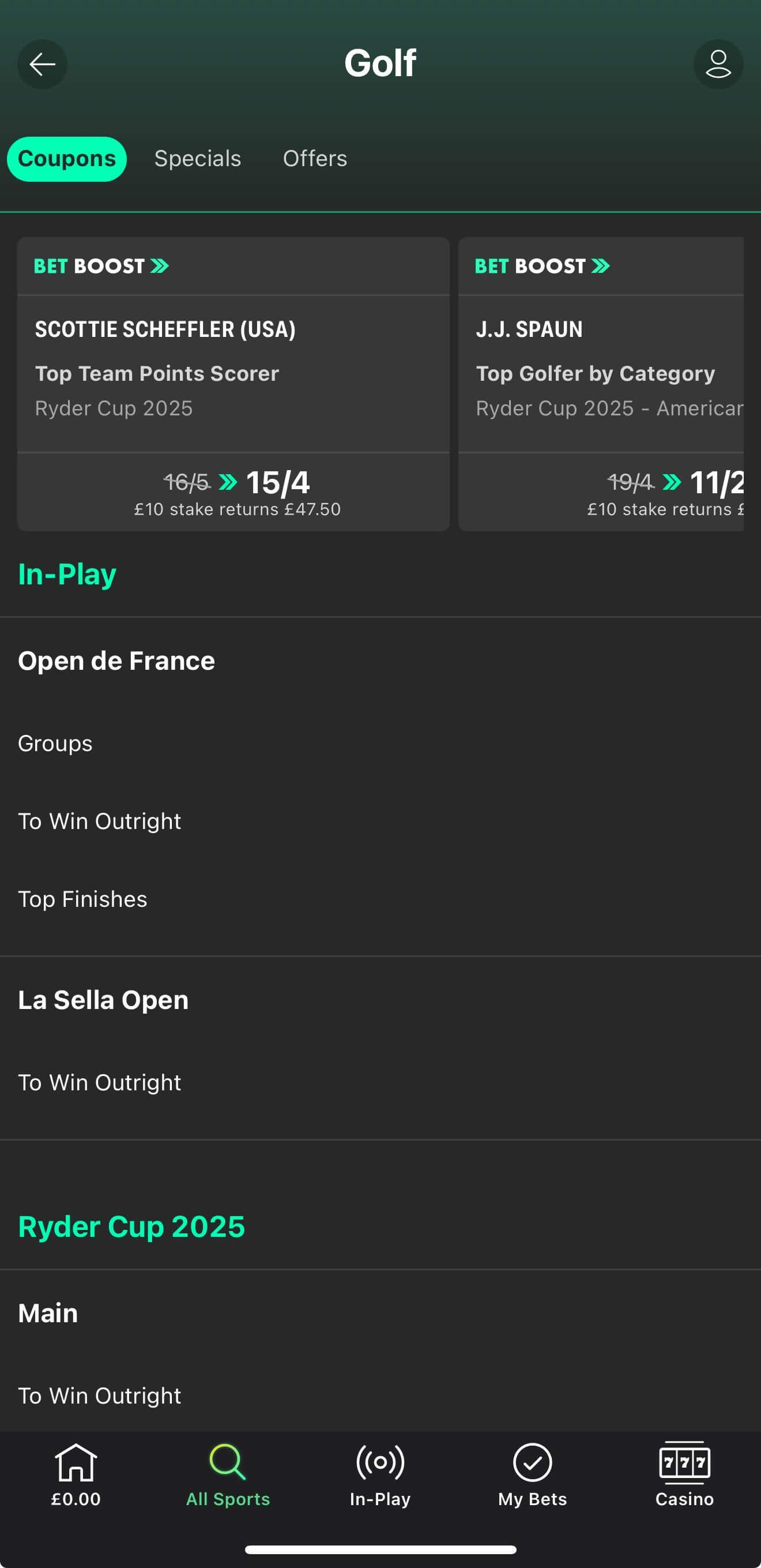 Bet boosts are available on outright markets on golf with bet365, which is something that isn’t available with some of the operators that feature in our top ten.