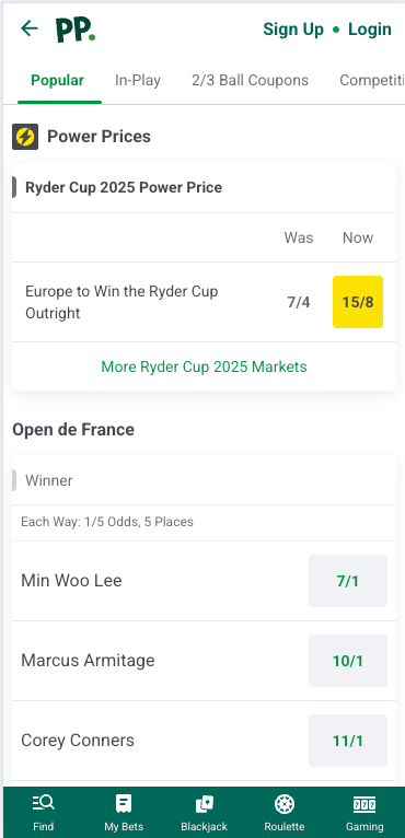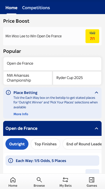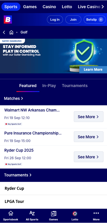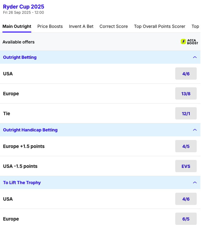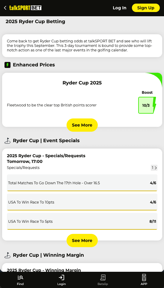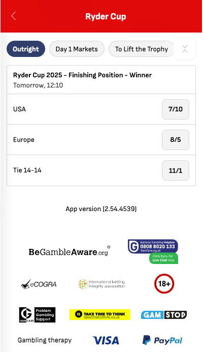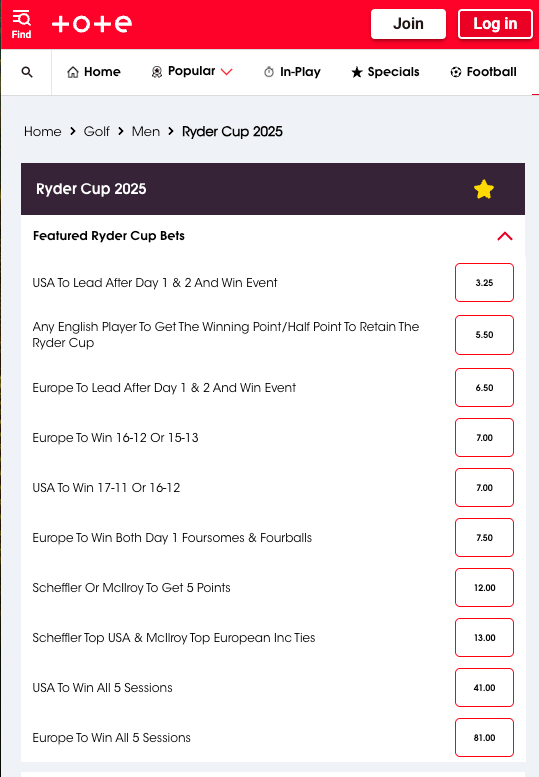 Tote has expanded its sportsbook to now offer more odds than ever before on sports, including golf. The betting site is well known and regulated in the UK, and bettors often feel comfortable and safe visiting the site. A good feature of Tote is its featured bets section. They typically have this for big sports events, like the Ryder Cup, and they display you some of the most exciting or bet on selections at the current time.