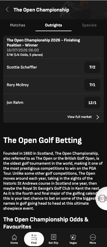 They have ante-post and specials markets accessible on golf, and with a strong sign-up offer that offers a sizeable amount in free bets, they’re a great golf betting site to use.