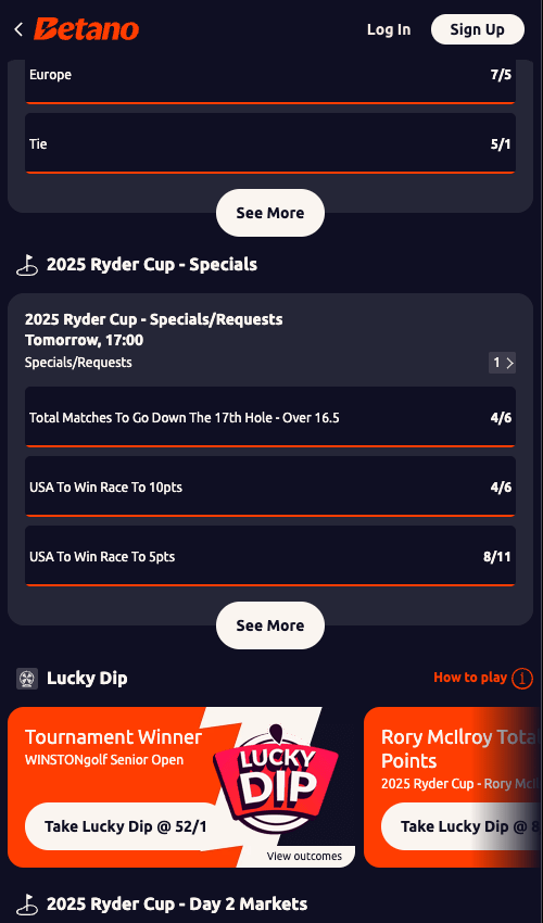 Betano have a great sportsbook and are definitely deserving of a place in the top five despite being a relatively new betting site in comparison to some of the other bookmakers on this list. With good welcome offers and exciting promotions. They run specials/requests bets for big golf events. They are running multiple request bets for the Ryder Cup.