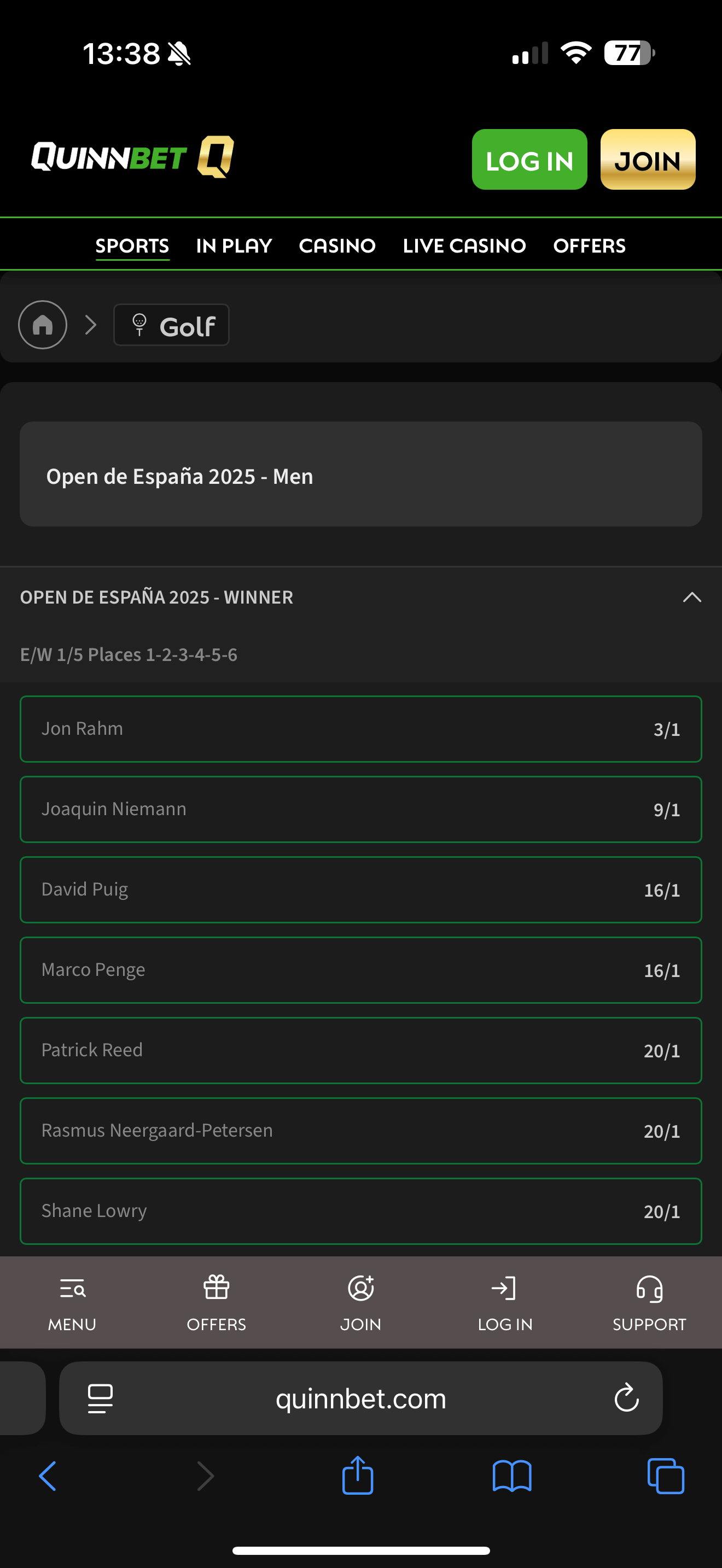 Quinnbet have got everything you need for golf betting, and are a great betting site to use, although the competitiveness of their odds could be improved on. Such promotions like event specials and price boosts make your golf betting experience even more enjoyable.