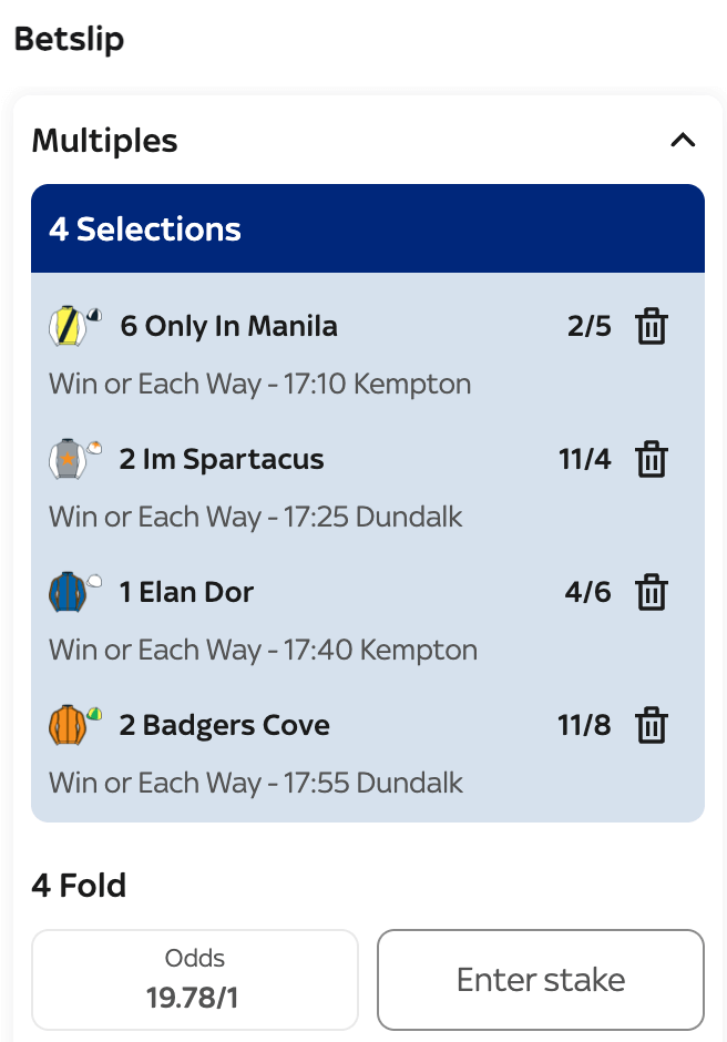 - We’ll then choose four selections from different races by adding them to our betslip.