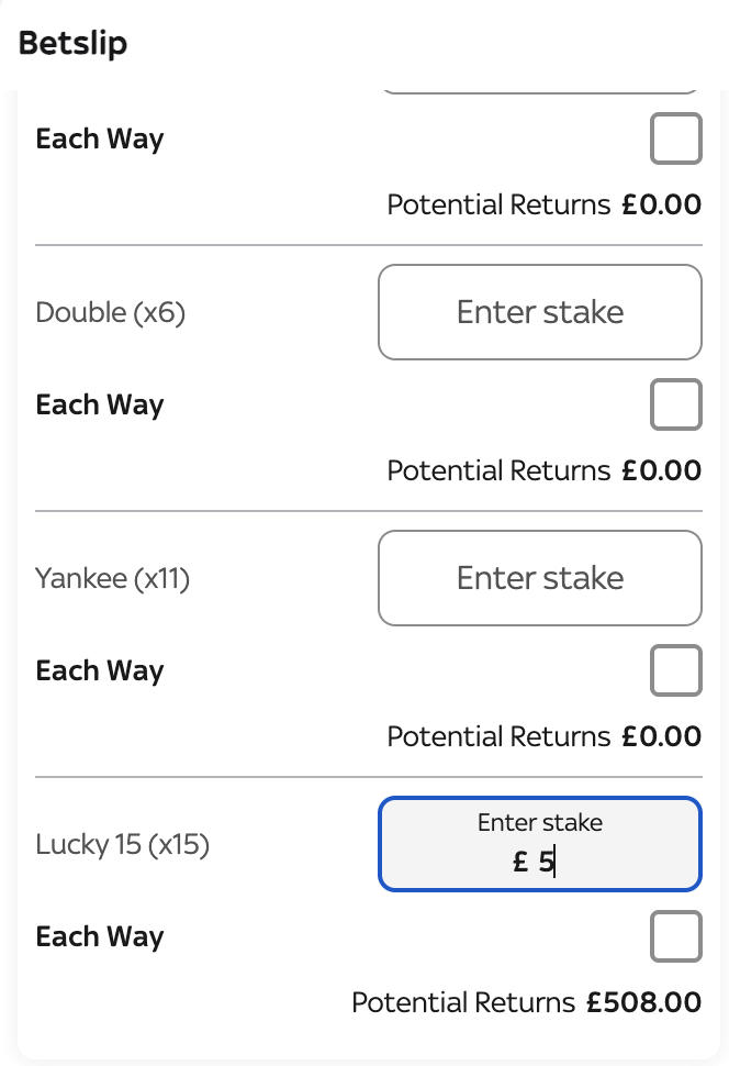- Click the ‘Place Bets’ option when you’re ready, and you will have placed a Lucky 15 bet with Sky Bet.