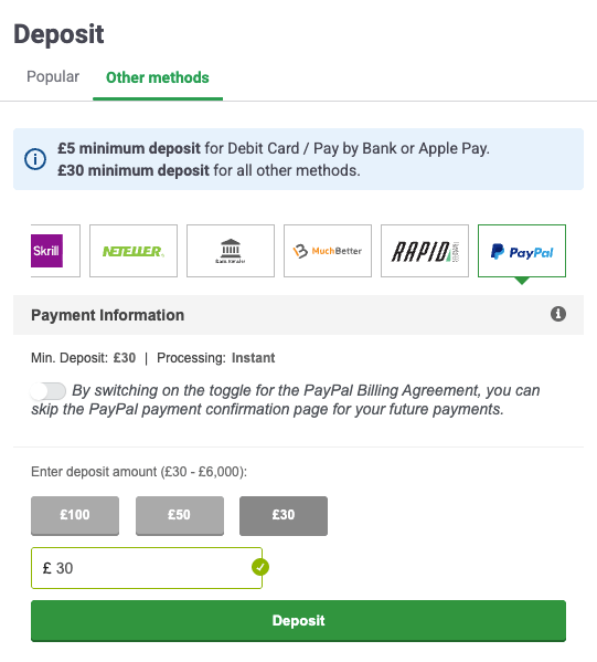 - There is typically a list of the available banking methods here, so have a look and then select PayPal as your preferred deposit option.