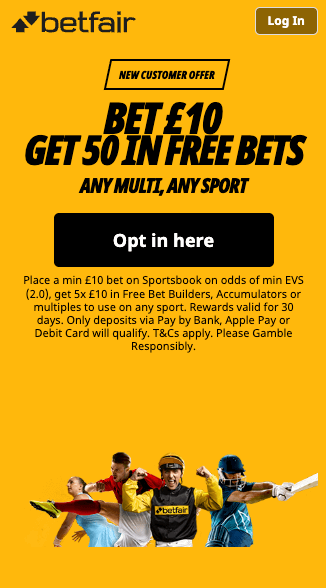 - Sports: Place a min £10 bet on Sportsbook on odds of min EVS (2.0), get 5x £10 in Free Bet Builders, Accumulators or multiples to use on any sport. Rewards valid for 30 days. Only deposits via Pay by Bank, Apple Pay or Debit Card will qualify. T&Cs apply. Please Gamble Responsibly.