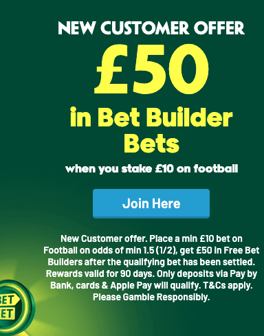 - Football: New Customer offer. Place a min £10 bet on Football on odds of min 1.5 (1/2), get £50 in Free Bet Builders after the qualifying bet has been settled. Rewards valid for 90 days. Only deposits via cards & Apple Pay will qualify. T&Cs apply. Please Gamble Responsibly. 18+. GambleAware.org