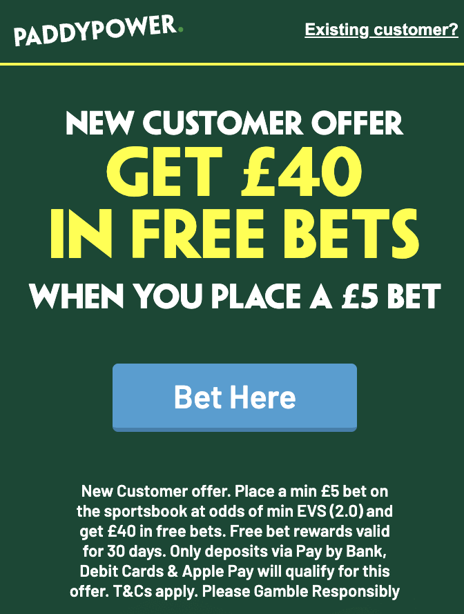 - Racing: New Customer offer. Place a min £5 bet on the sportsbook at odds of min EVS (2.0) and get £40 in free bets. Free bet rewards valid for 30 days. Only deposits via Pay by Bank, Debit Cards & Apple Pay will qualify for this offer. T&Cs apply. Please Gamble Responsibly. 18+. #ad