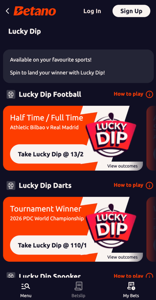 Betano Lucky Dip gives new and existing customers the chance to have a betting market selected for them at random by Betano. You’ll have to choose your Lucky Dip market, enter your stake, and then spin the wheel to randomly have your bet prepared for you. Below, you’ll find an example of this promotion being in place on football.