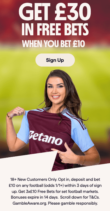 Key Betano T&Cs: 18+ New Customers. Opt in, deposit and bet £10 on any football (odds 1/1+) within 3 days of sign up. Get 3x£10 Free Bets for set football markets. Bonuses expire in 14 days. Full T&Cs Apply. GambleAware.org . Please gamble responsibly.