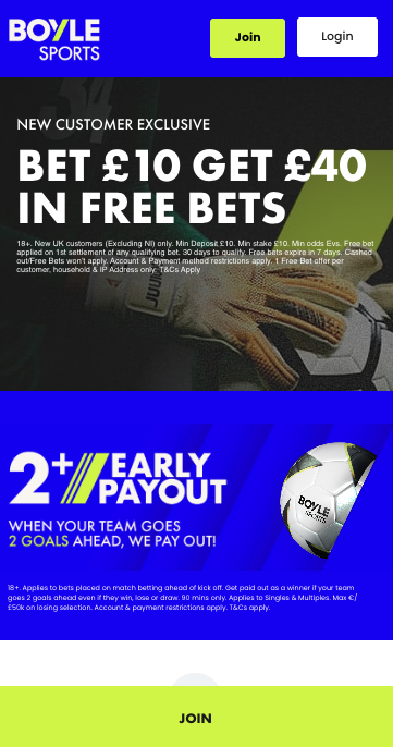 The BOYLE Sports welcome offer gives new customers £30 in free bets, an early payout when your team goes 2 goals ahead and also a £10 casino bonus.