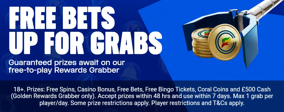 With the Coral Rewards Grabber promotion, you are guaranteed a prize with every grab from their free-to-play game. All you have to do is log in and use the claw to grab a prize. You can win free spins, casino bonuses, free bets, free bingo tickets and Coral coins, and there’s even the opportunity to win £500 cash.