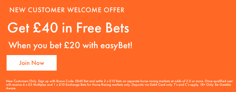 Key T&Cs: New Customers Only. Sign up with Bonus Code: EB40 Bet and settle 2 x £10 Bets on separate horse racing markets at odds of 2.0 or more. Once qualified user will receive 6 x £5 Multiples and 1 x £10 Exchange Bets for Horse Racing markets only. Deposits via Debit Card only. T’s and C’s apply. 18+ Only. Gamble Aware.