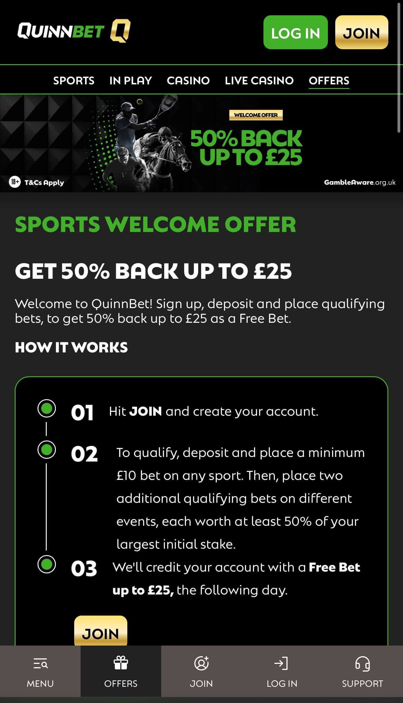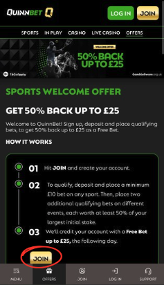 The QuinnBet promo code sees you receive 50% back of your first days losses as a free bet up to £50. You can bet a minimum of £10 on any sportsbook market to be eligible for this offer and you need to meet certain requirements to be able to receive the free bets.