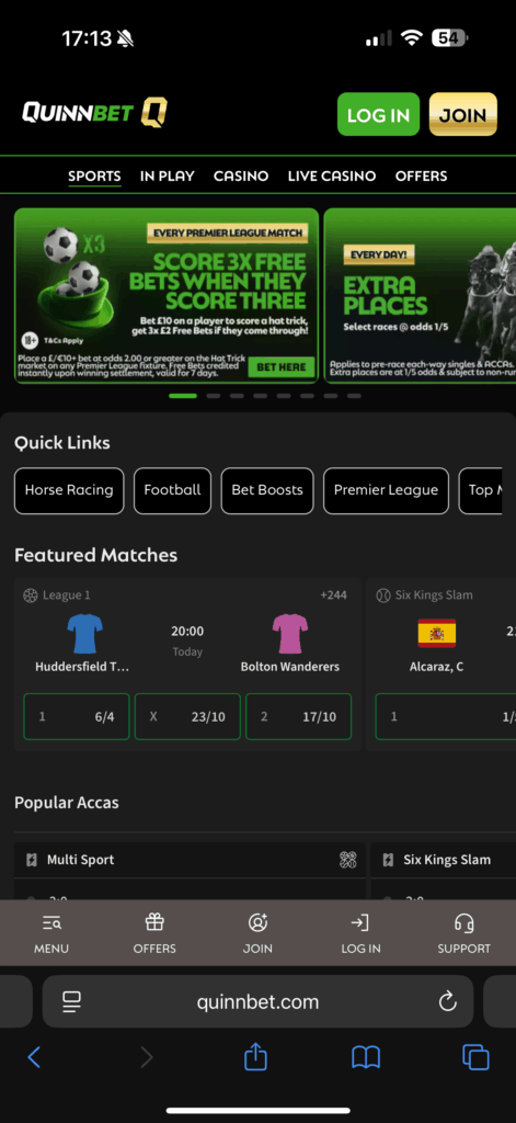 New UK customers can take advantage of their current welcome offer, which refunds 50% of your losses from your first day as a free bet, up to £50. This new customer offer has a fair few terms and conditions which makes it a little bit more complicated than other sign up offers available, but it’s still a very good one and we definitely recommend using it. QuinnBet also has exciting promotions for existing customers and these can see you receive free bets or boosted winnings across sports like football and horse racing.